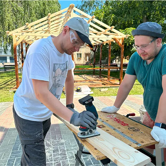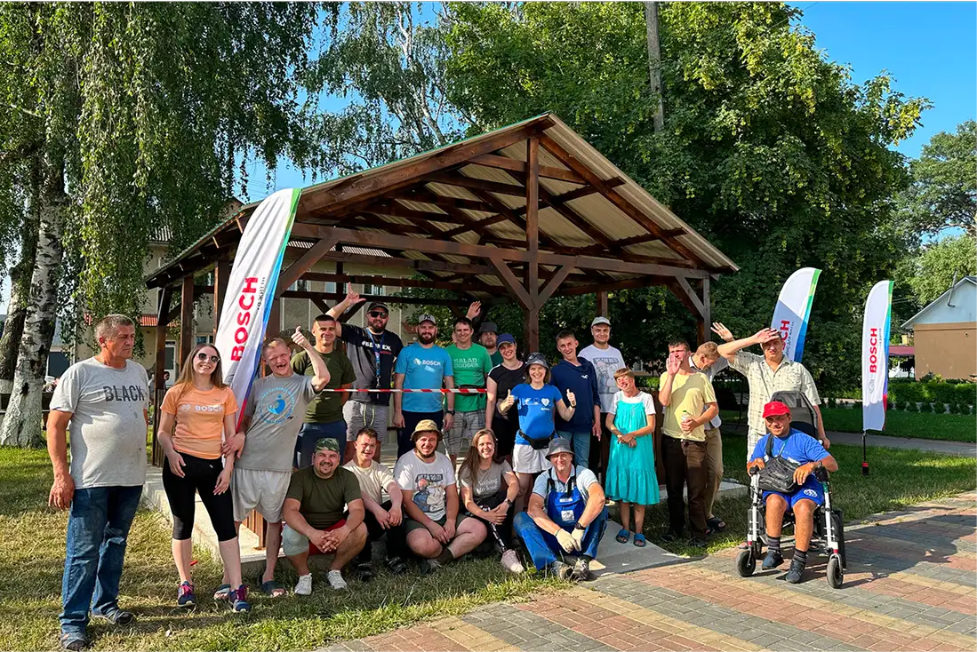 Волонтери-працівники компанії Bosch збудували альтанку для мешканців будинку-інтернату. Усе було створено власними руками — від ескізів і планування до самого будівництва. Результат - чудова альтанка, де вихованці інтернату тепер проводять час на свіжому повітрі.