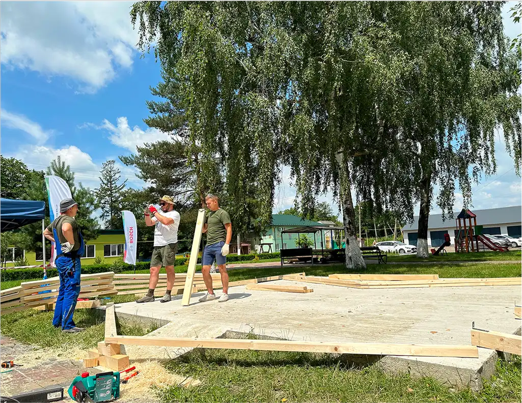 Ініціатива будувати альтанки для дитбудинків і геріатричних пансіонатів зародилася 2018 року. Відтоді завдяки локальній команді Bosch з’явилися альтанки в будинках для літніх людей у Чернігівській та Київській областях. Нещодавно команда Bosch збудувала альтанку для вихованців будинку-інтернату на Івано-Франківщині, якому надає підтримку вже багато років. У закладі мешкають діти й молоді люди з інвалідністю. Дехто з них не може самостійно пересуватись і дбати про себе. Із початком повномасштабної війни до інтернату евакуювали дітей із прифронтових зон – тепер тут живе понад 100 осіб.