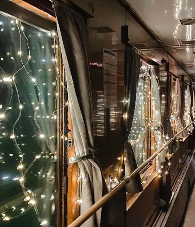Прикрасити купе в потягу гірляндою на батарейках, поставити на стіл маленьку ялинку. Переодягнутися в піжами.